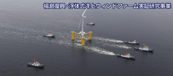 福島洋上風力コンソーシアムは、経済産業省からの委託事業として、浮体式洋上ウィンドファーム実証研究事業を推進しています。本実証研究事業は第1期実証研究事業として2MWのダウンウィンド型浮体式洋上風力発電設備1基、浮体式洋上サブステーション、第2期として、5MWおよび7MWの浮体式洋上風力発電設備2基を2016年までに福島沖に増設します。本実証研究事業を通じて、浮体式洋上風力発電のビジネスモデルを確立し、大規模ウィンドファームへ事業展開し更に福島復興に向けた風力産業集積を目指します。