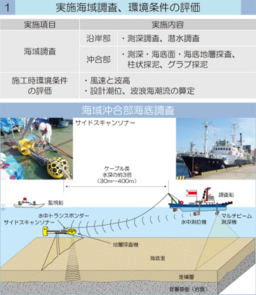 本実証実験では、事前調査、施工に関わる設計条件の設定を行い、漁場他環境に与える影響を最小化する施工技術を開発します。これにより、厳しい気象・海象条件下、浮体式洋上風力発電所の効率的な施工技術及び実施海域に合った複数浮体の係留システム技術を確立します。